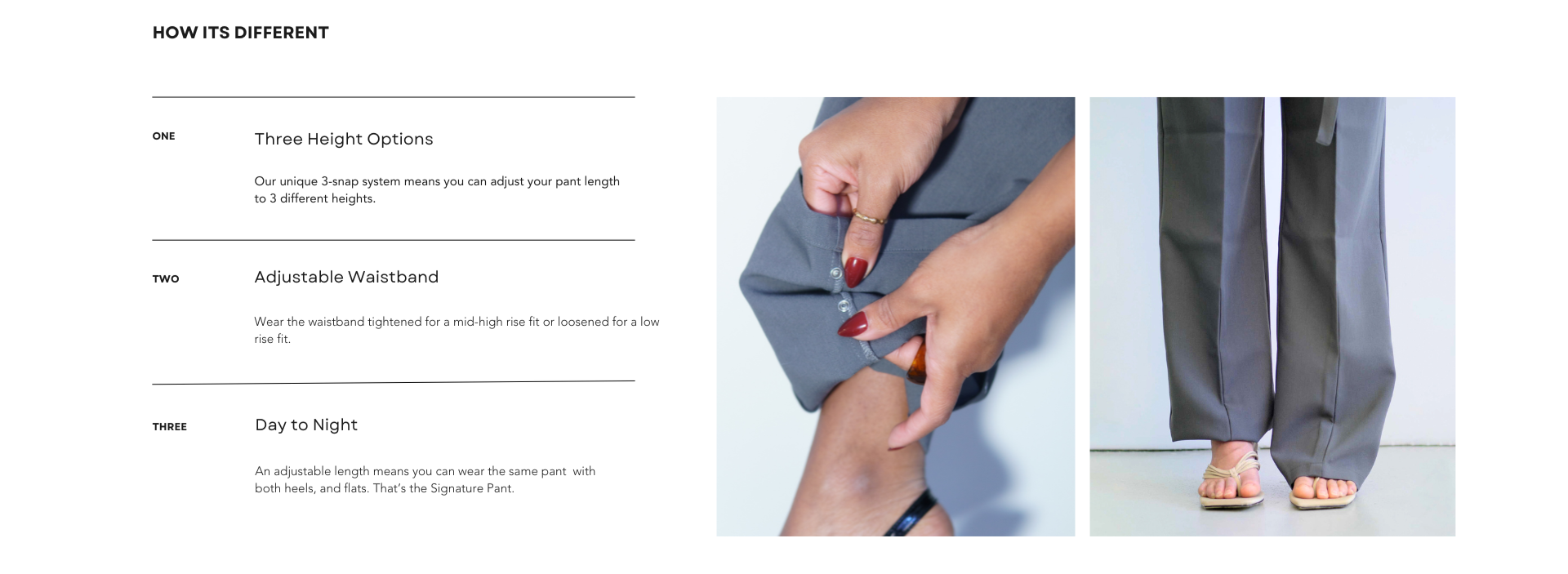 The Signature Pant features an adjustable hem, with 3 different height options. Easily shorten or lengthen the pant to wear with heels, or flats.